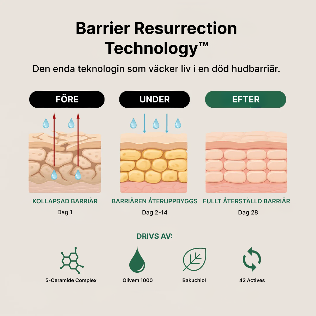 Till skillnad från vanliga hudkrämer som bara återfuktar hudens yta, går vår formula in på djupet och behandlar det som verkligen orsakar din papperstunna hud. När huden får den där skrynkliga, slappa strukturen beror det på tre saker: du har förlorat kollagen, din fuktbarriär är skadad och cellförnyelsen har saktat ner.